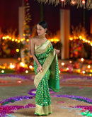 Green Banarasi silk saree, a true embodiment of elegance and tradition. Crafted from fine silk, it features a rich, lustrous texture that catches the light beautifully. Gold zari work adds a touch of royal charm.