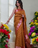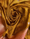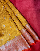 A mustard yellow Sarton Tanchhui silk saree with a golden border would exude sophistication and elegance, blending the subtle charm of mustard yellow with the opulence of golden accents and a red pallu