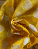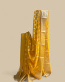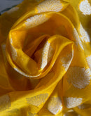 A classic yellow georgette Banarasi saree wiis a graceful choice for occasions like day weddings, festivals, family gatherings, and formal parties. The bright yellow color combined with the richness of the golden zari makes it a standout choice.