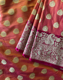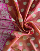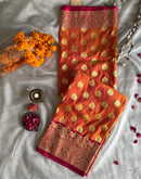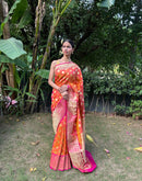Beautiful orange and pink Banarasi silk saree features a rich, vibrant palette that captures attention. Adorned with stunning motifs, the saree showcases intricate designs typical of Banarasi craftsmanship.
