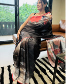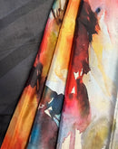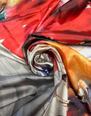 A black digital print satin saree combining the smoothness of satin fabric with a modern digital design in red and grey. A must have for a casual date or an evening out.