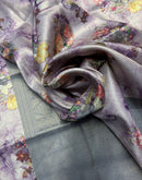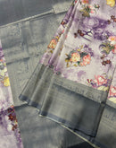 Silk printed saree with grey border is perfect for adding a touch of sophistication and style to your wardrobe, suitable for various festivals and celebrations, where their rich texture and vibrant prints can make a strong style statement.