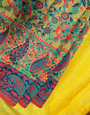 A cotton linen yellow handloom woven saree with a multi-color traditional pattern is beautiful and versatile.