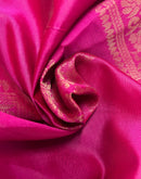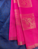 A soft pink Banarasi silk saree with a blue contrast pallu combines the rich heritage of Banarasi weaving with a rich color.