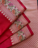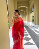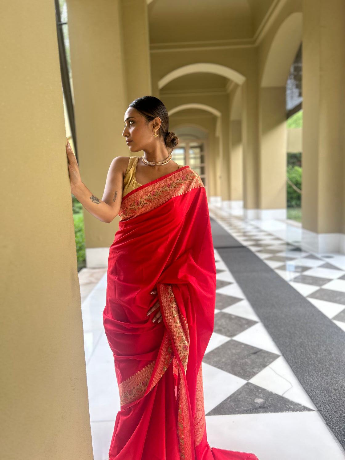 A beautiful plain red banarasi saree with a running border is a classic and elegant choice. The combination of a decorated border and a plain body highlights the richness of the silk fabric while highlighting the pallu design.
