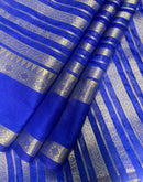 A royal blue banarasi beauty in georgette silk. The silver zari work in vertical patterns makes it a regal wonder. A fine mix of tradition and modernity, this is a great ensemble for evening wears, cocktails and parties!