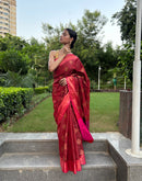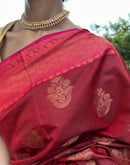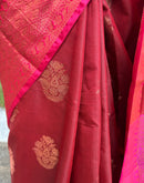 Maroon silk saree with contrasting red border and classy motifs all over combines two rich and warm tones.
