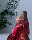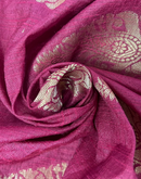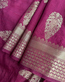 This Banarasi Tussar Silk Saree with classic booti design and a traditional border is characterized by a unique texture backed by a maroon color. This saree is a timeless rendition of heritage Banarasi artistry.