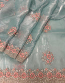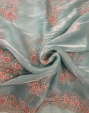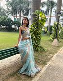 Exquisite blue crush organza saree is a perfect blend of elegance and charm, making it an ideal choice for festive season. Crafted from lightweight organza, the fabric drapes beautifully, creating a graceful silhouette