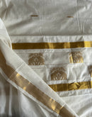 Exquisite White and Gold Saree, a perfect blend of timeless elegance and festive glamour. The pallu of the saree is a masterpiece in itself, showcasing a rich gold design.